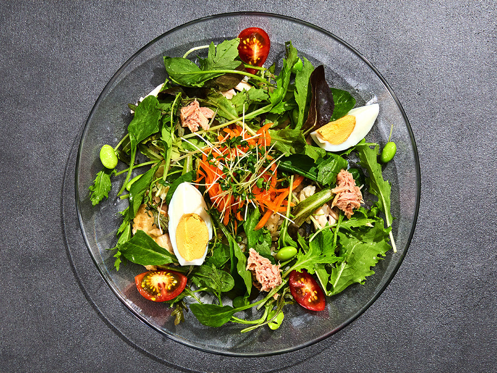 手羽先からお肌の元となるたんぱく質とコラーゲンを摂取し、ミニトマト、えだまめに含まれるβカロテンとオリーブオイルのオレイン酸の抗酸化作用で、健康な肌をサポートします。また、食物繊維が豊富な玄米ブレンドに加え、ツナのDHAやオリーブオイルなどの良質な脂質を取ることで、すっきりした毎日につながります。